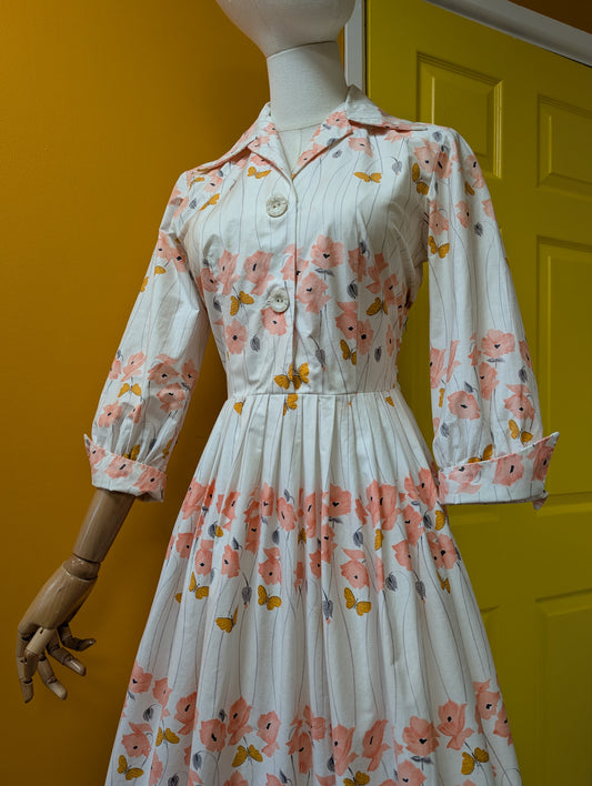 50s/60s floral butterfly print cotton dress - 37"B 29"W
