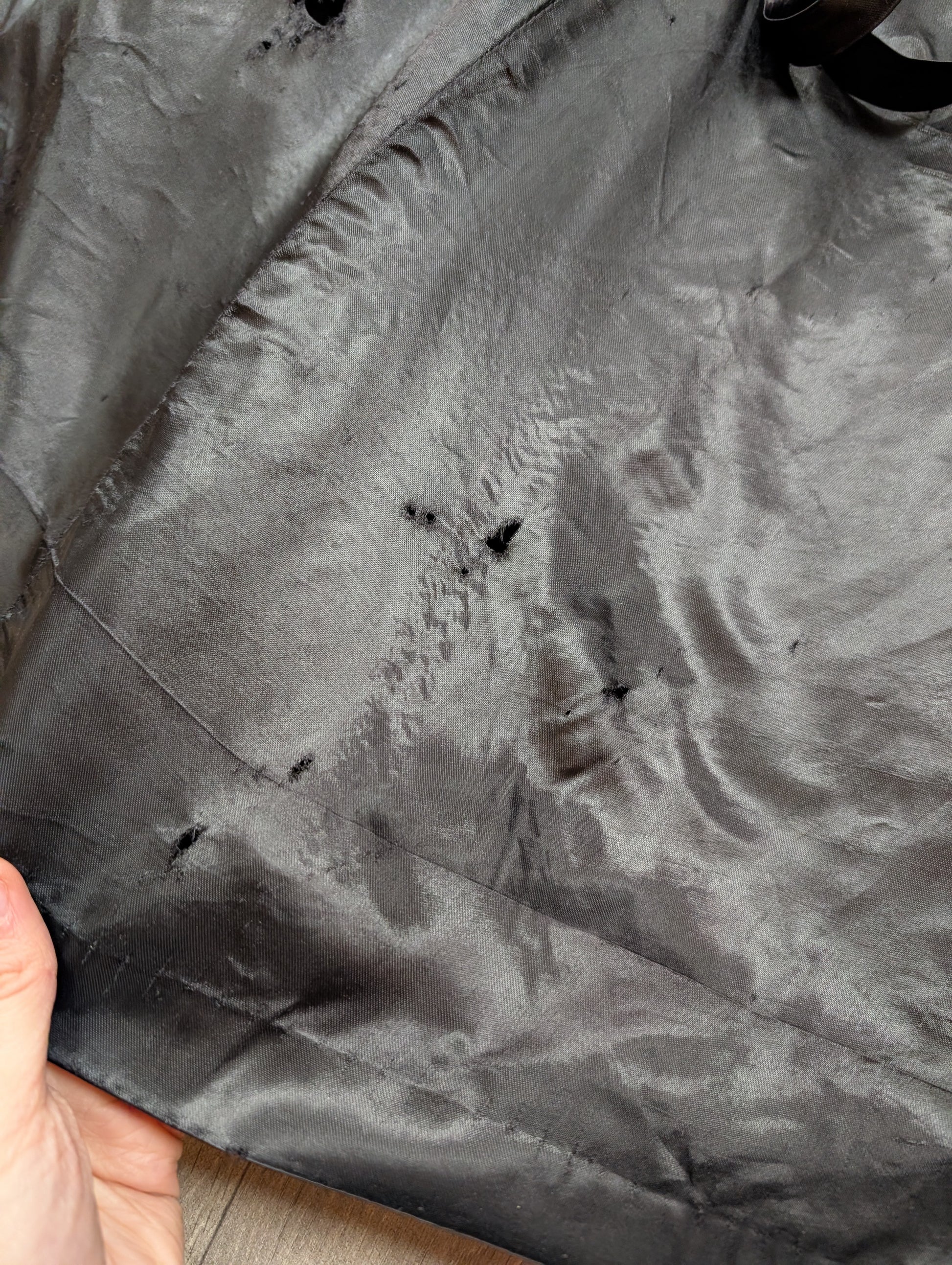 - There are numerous holes to the lining. Luckily, the outer wool looks to have survived mainly unscathed with just a few small pulls