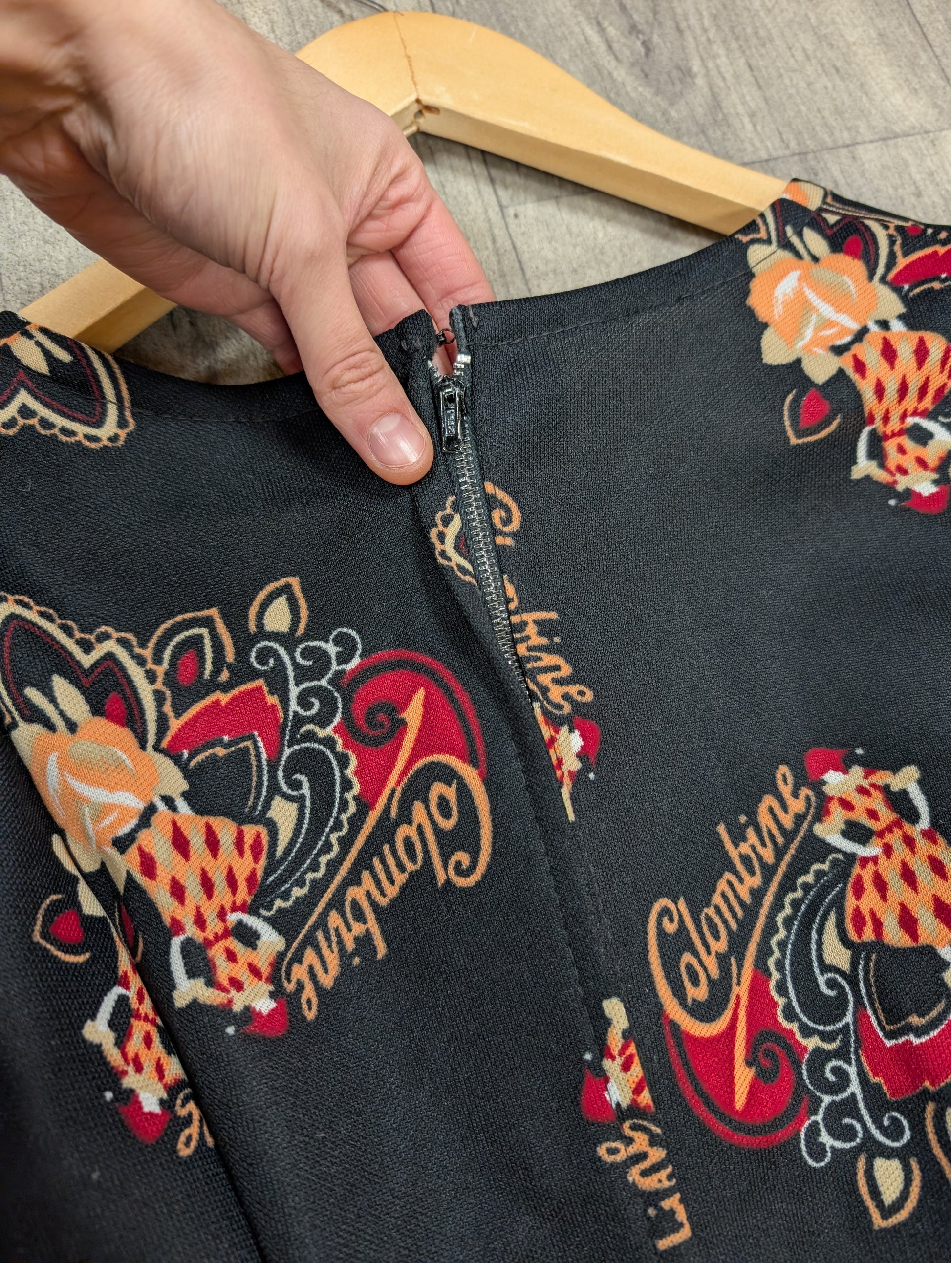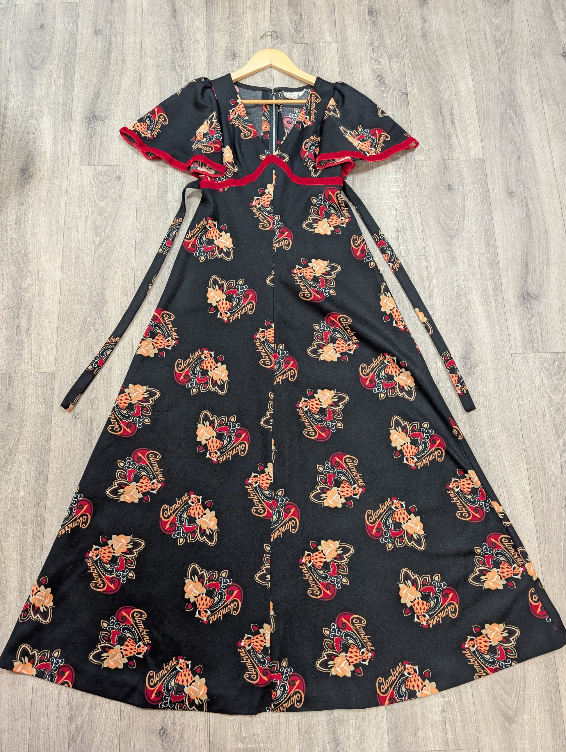 Fabulous 1970s Columbine print maxi dress with red velvet trim