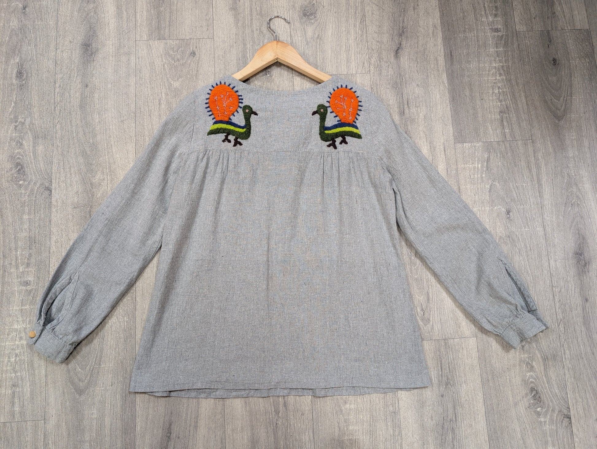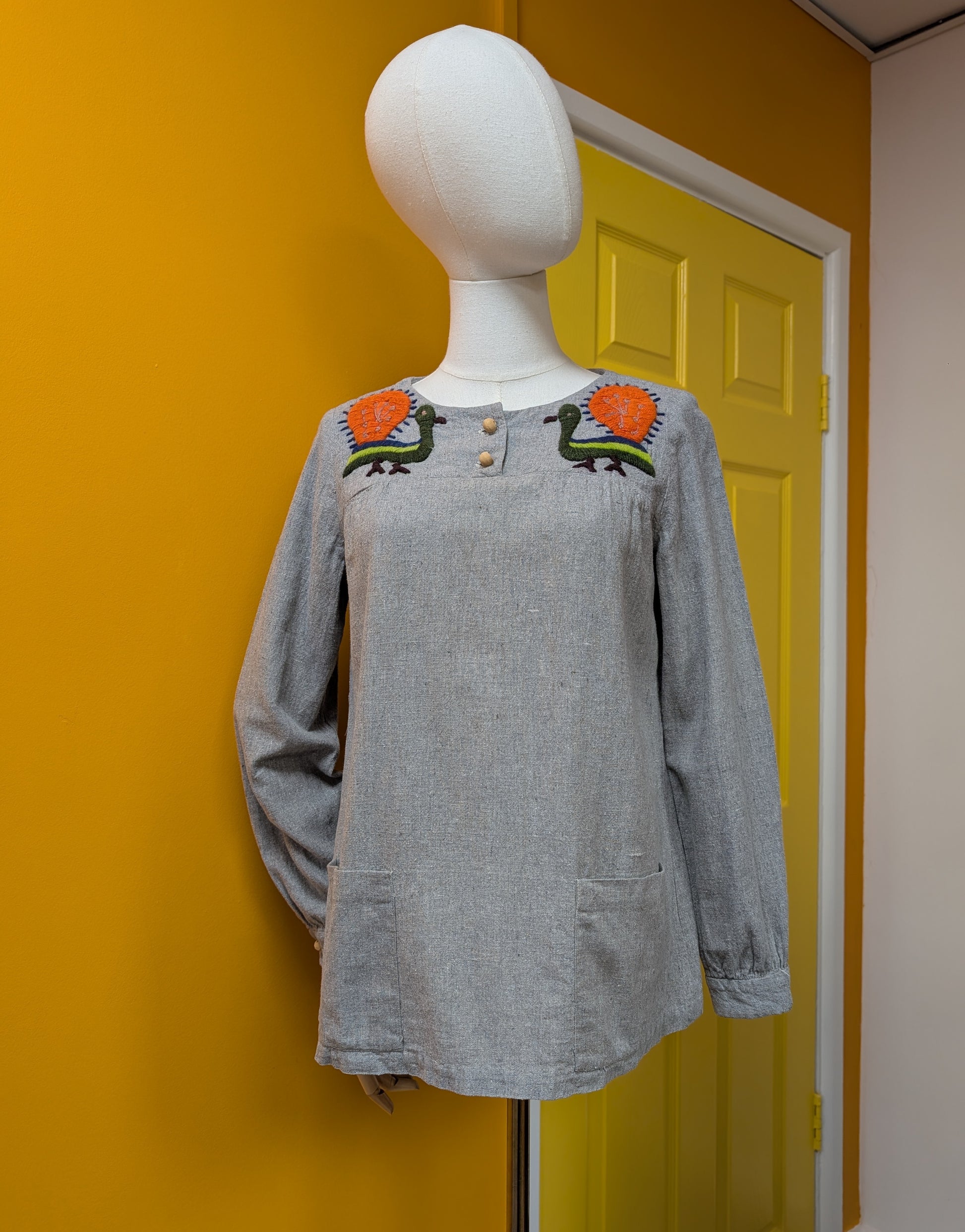 An absolutely beautiful 1970s India Imports cotton top with the sweetest embroidered peacocks on the front and back!