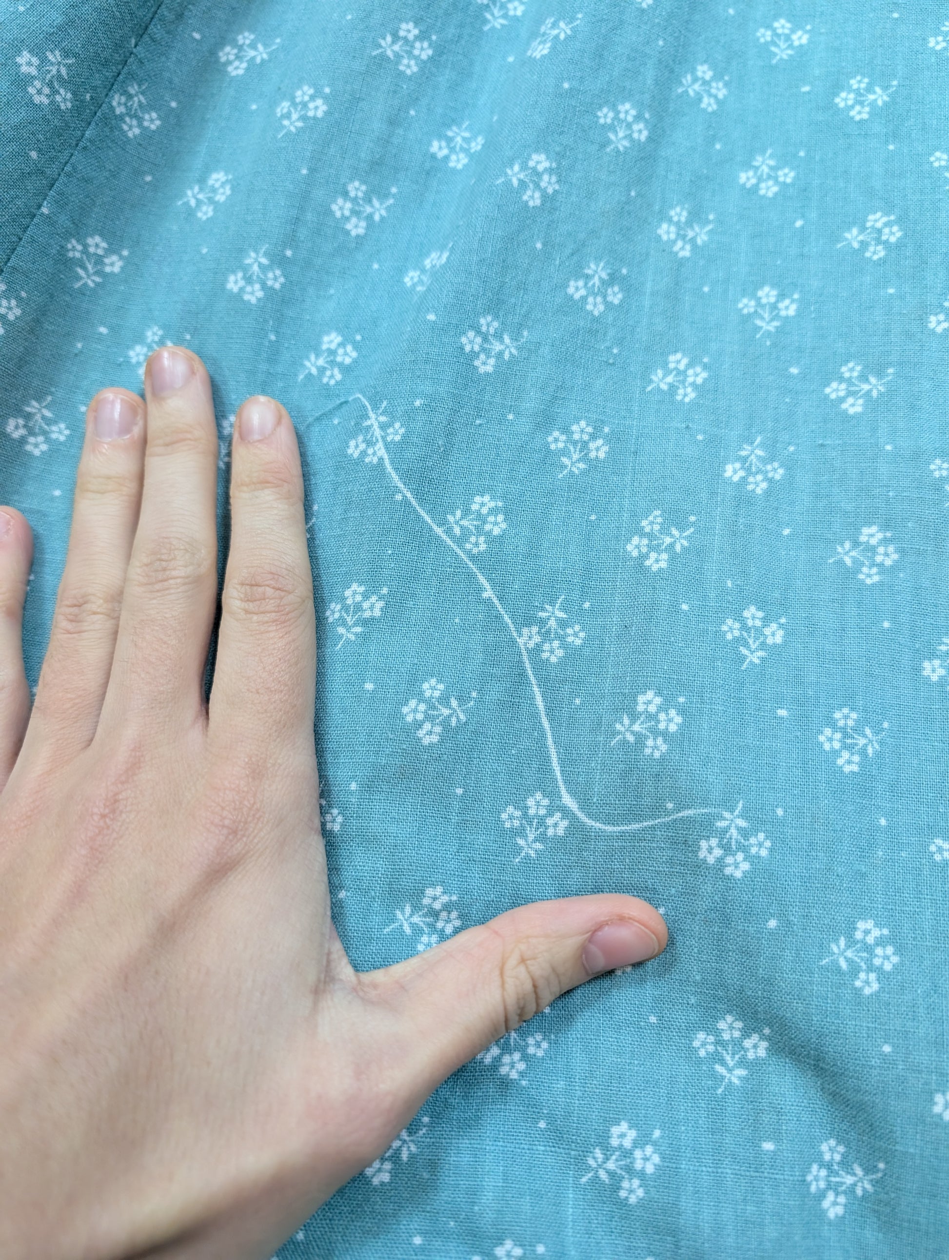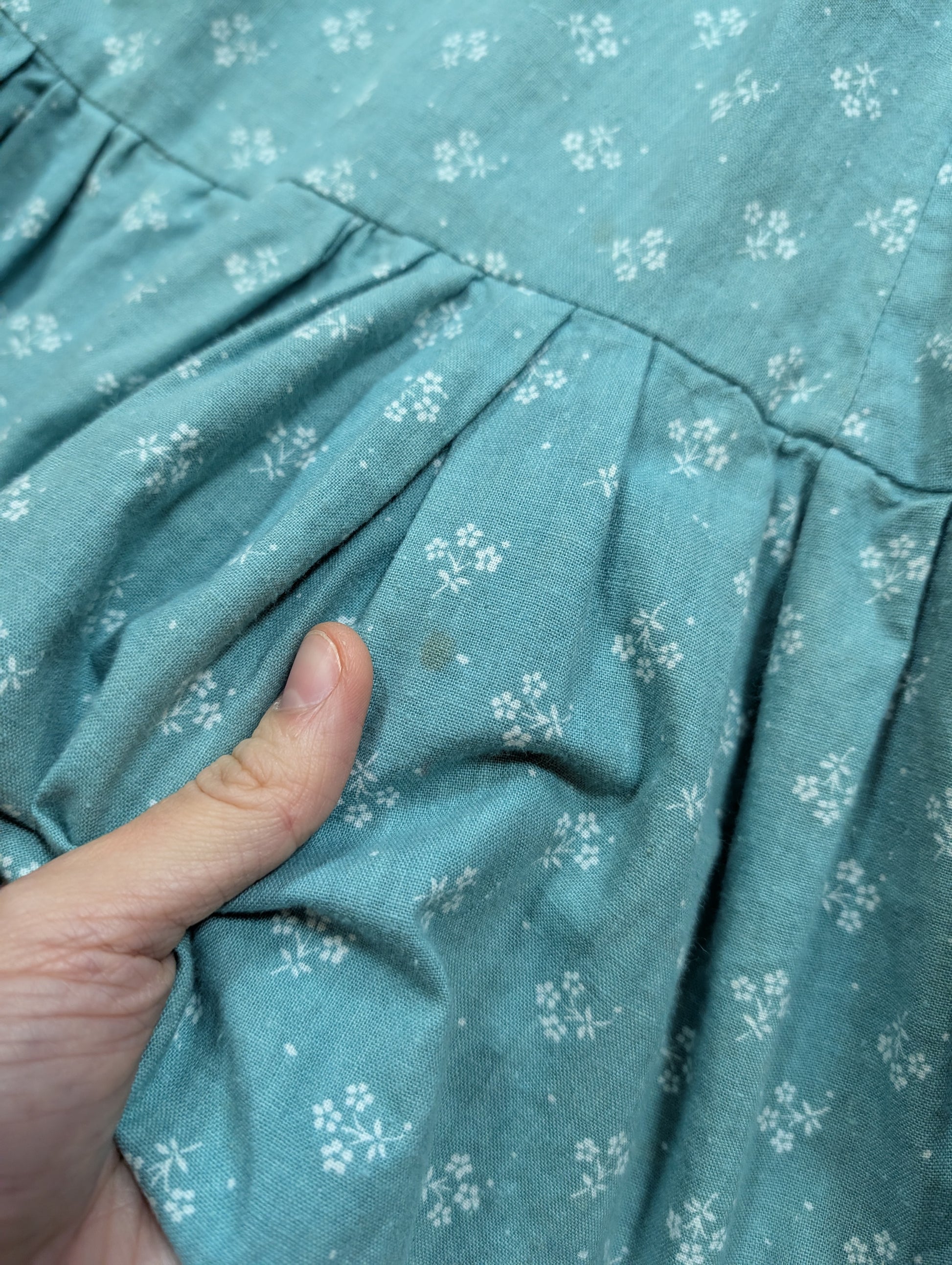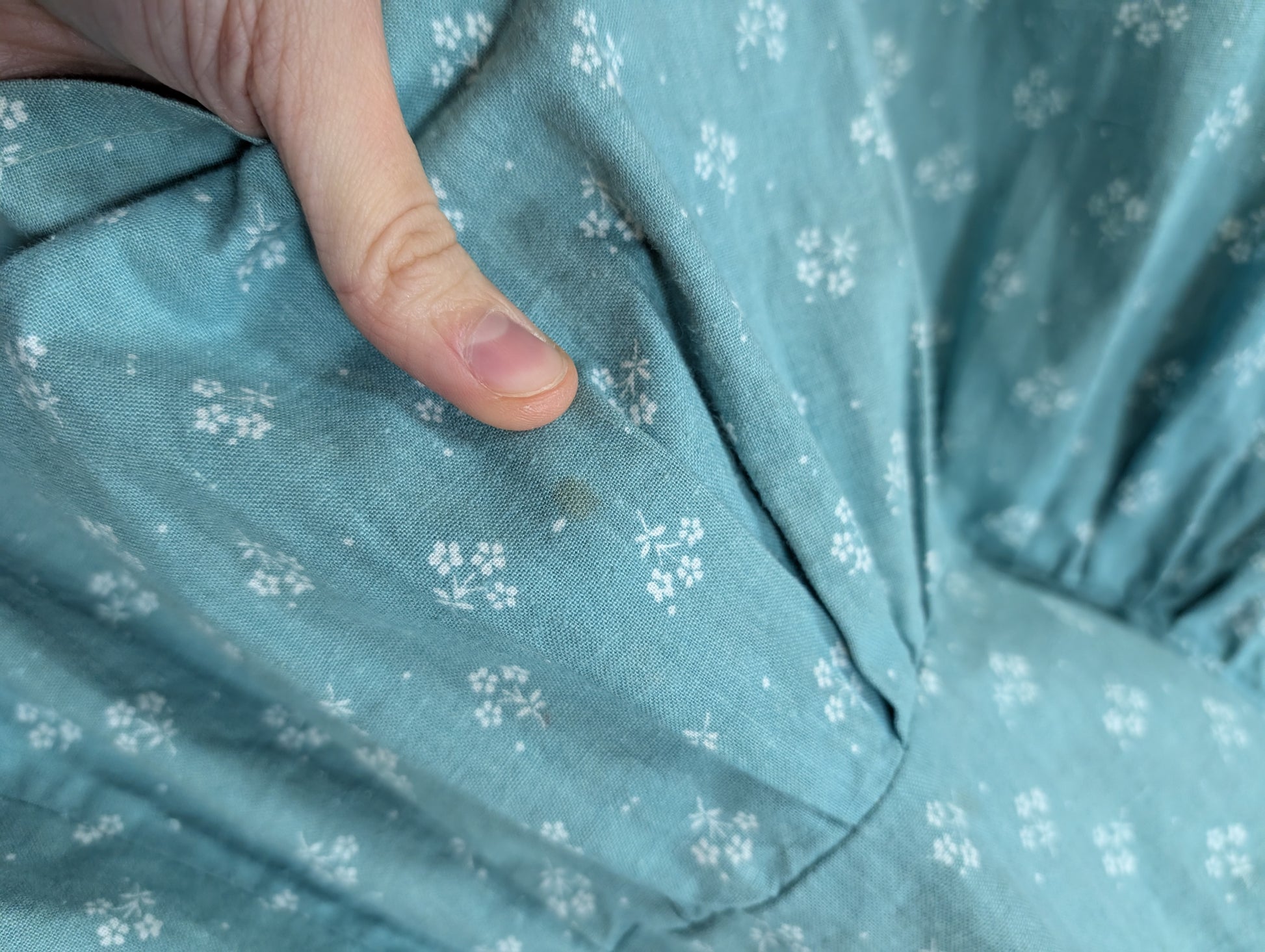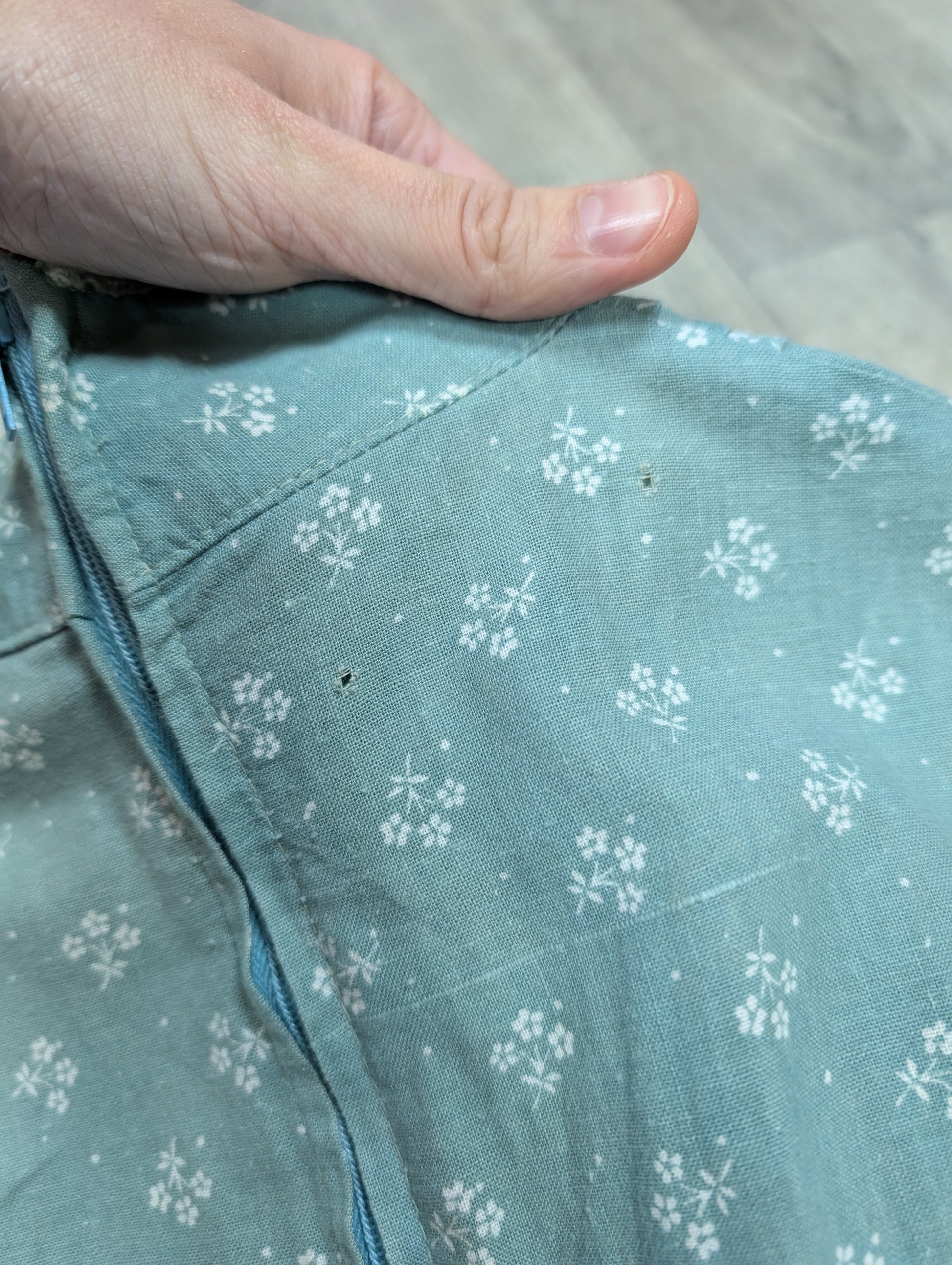 - 2 small holes at the back of the neck to one side and a small spot of wear just above the back of the waist