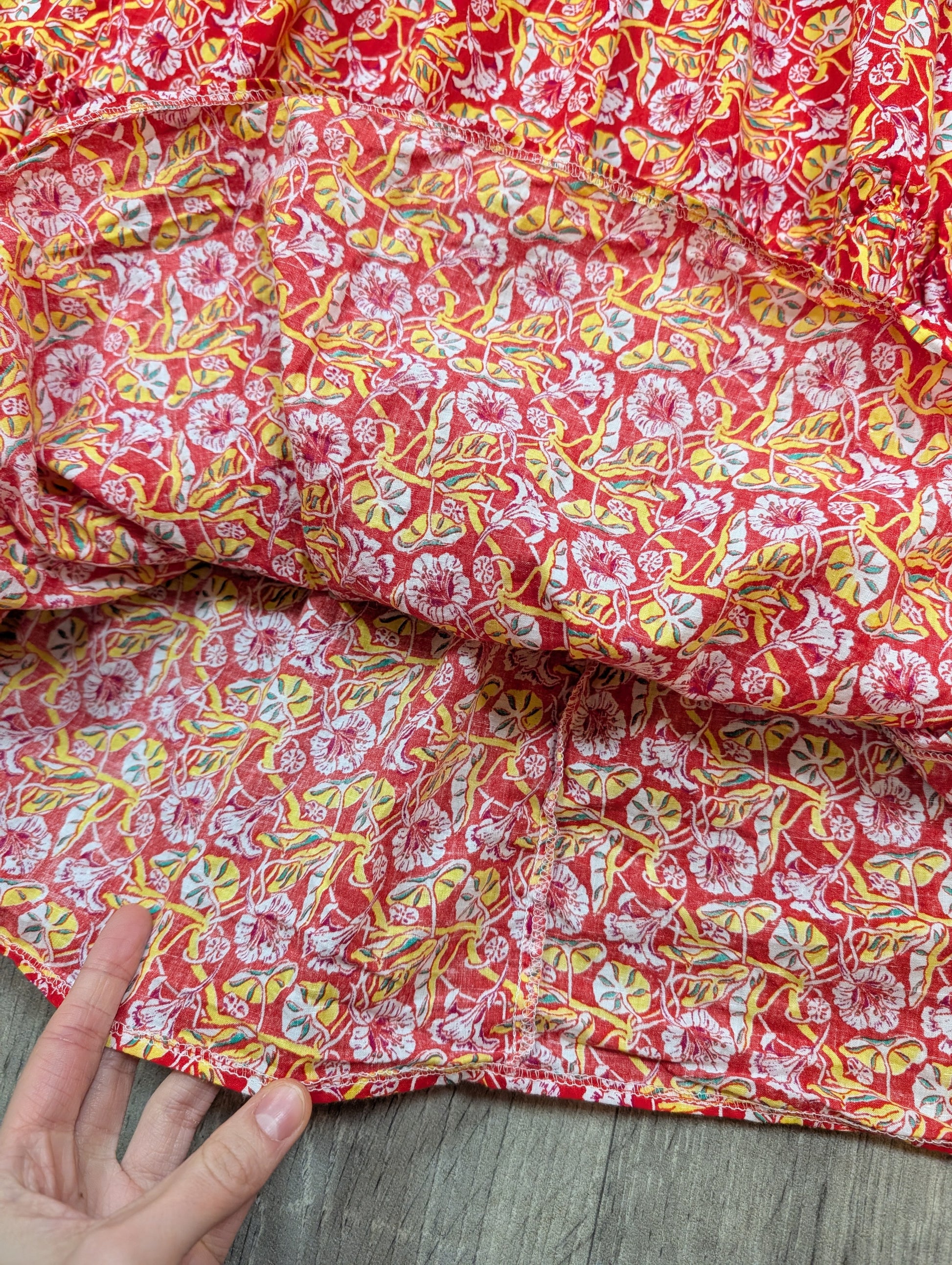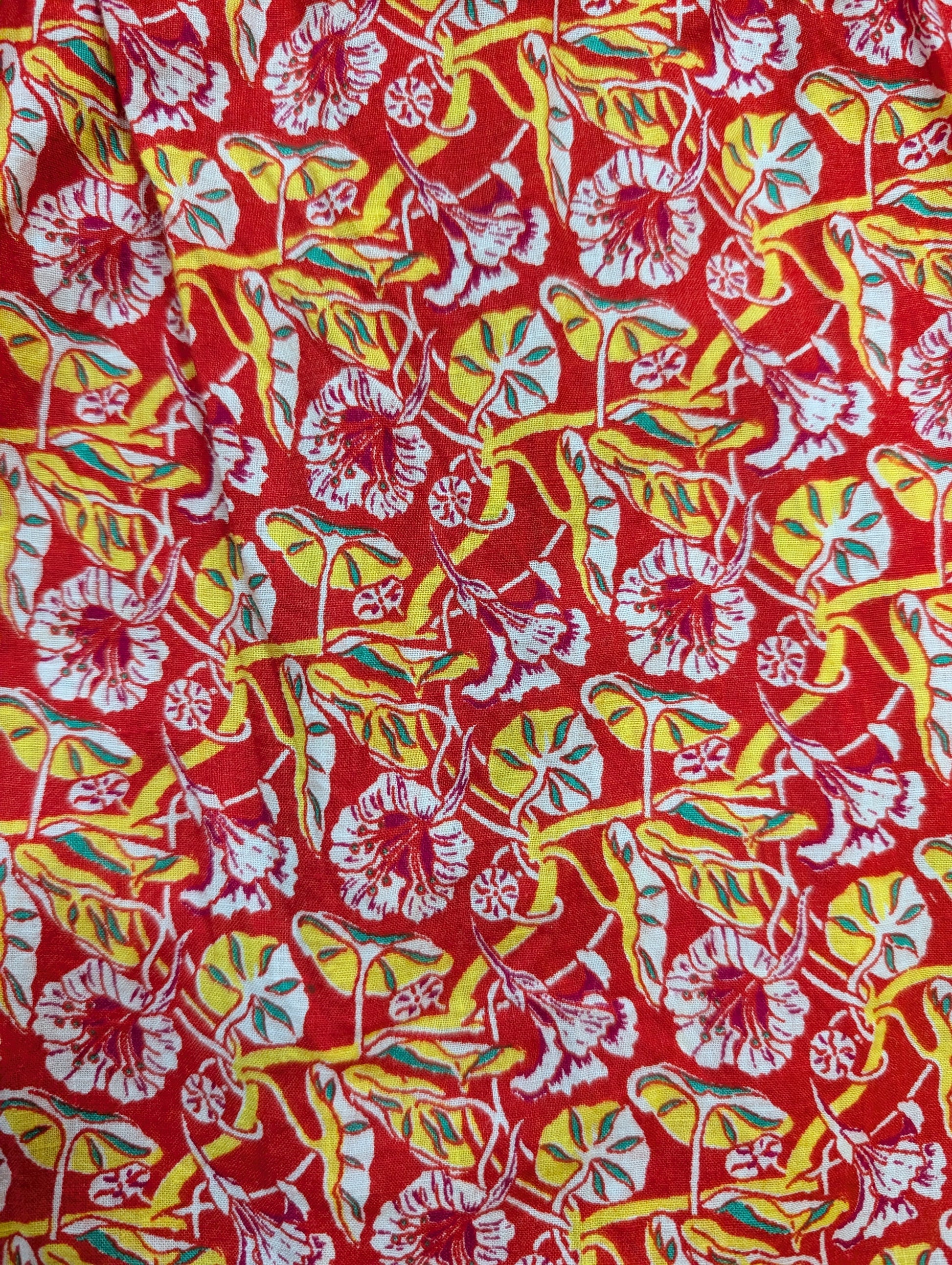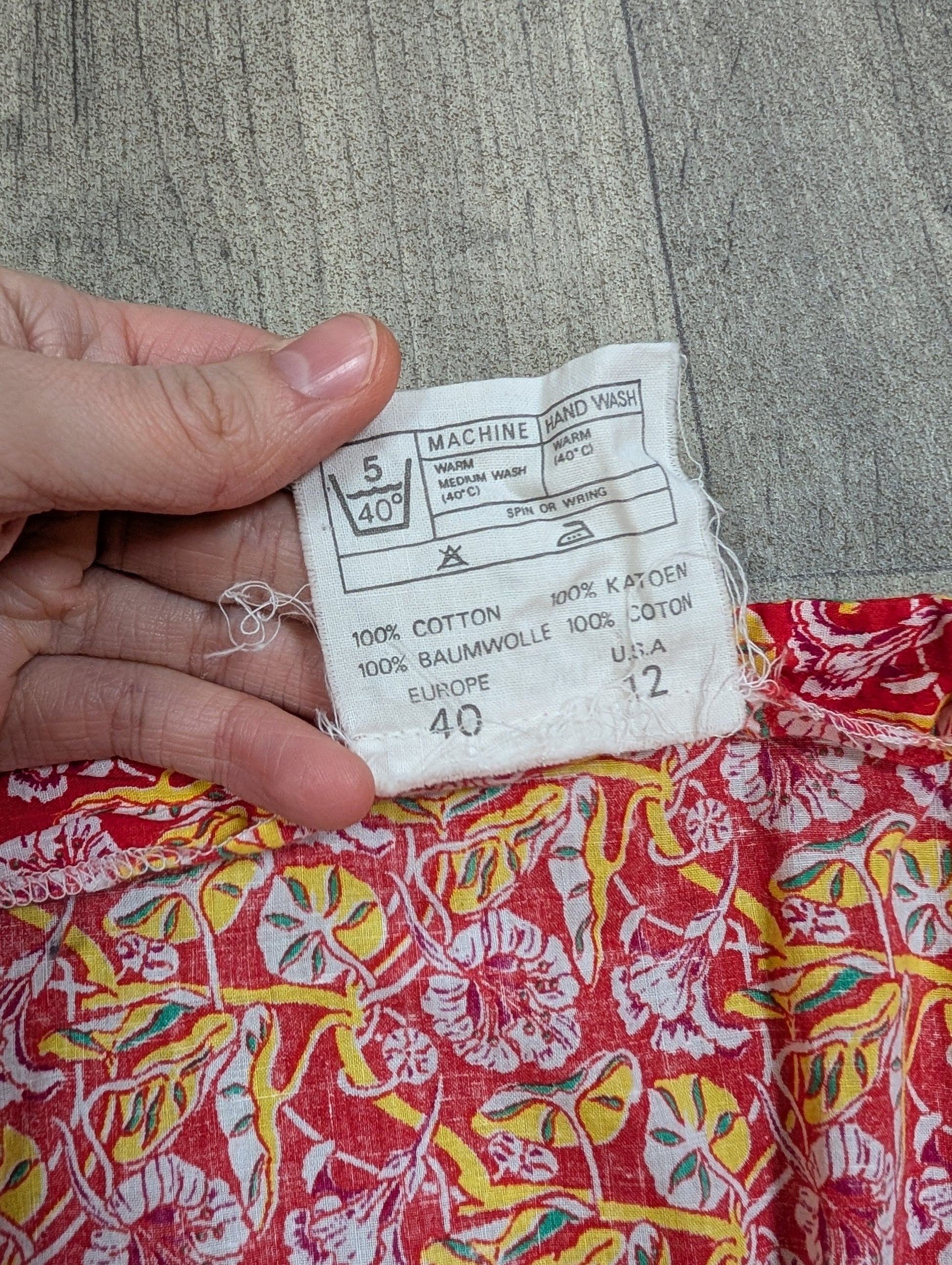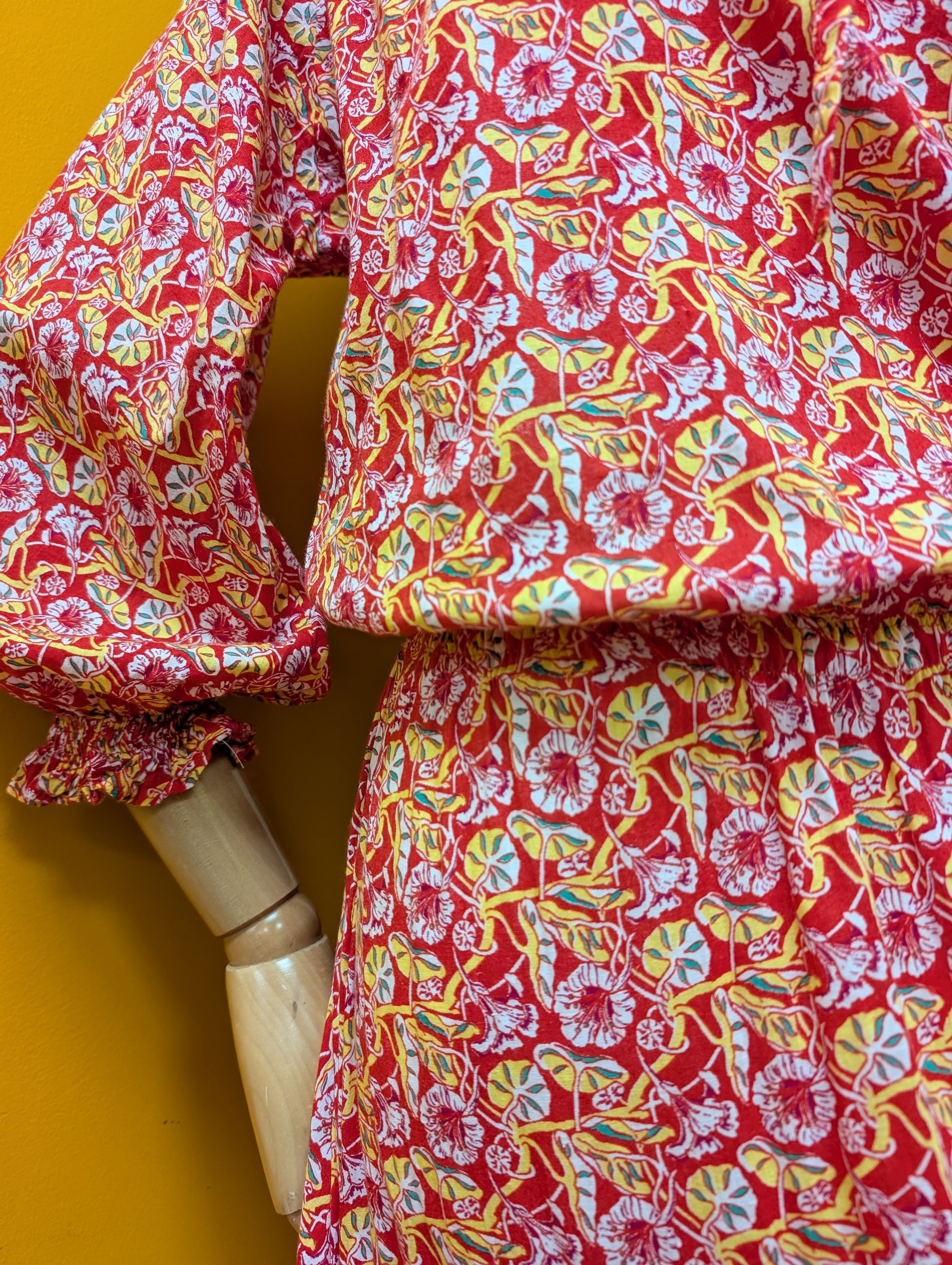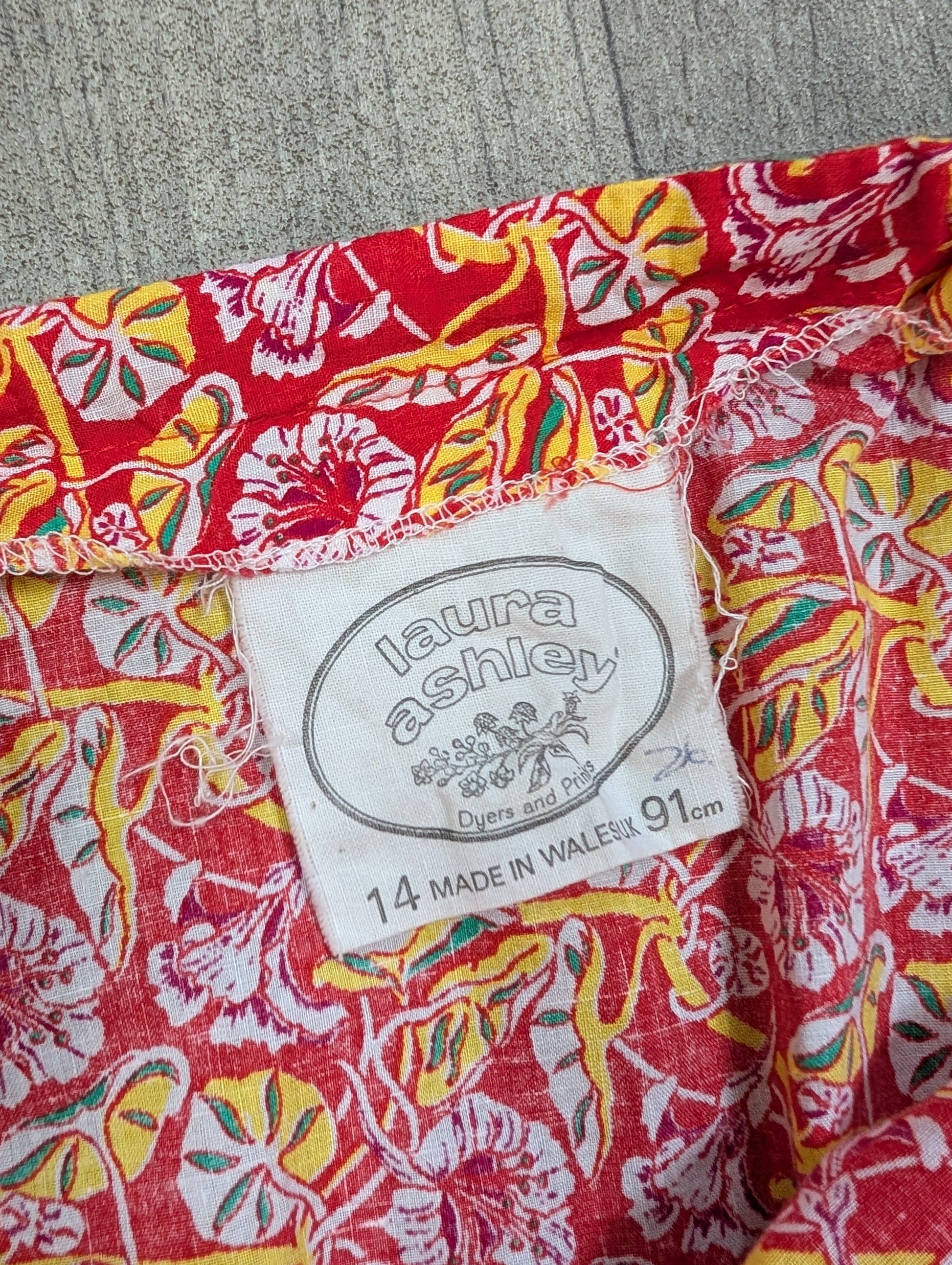 An absolutely stunning 1970s Laura Ashley dress with a really unusual print of red, yellow, white and green