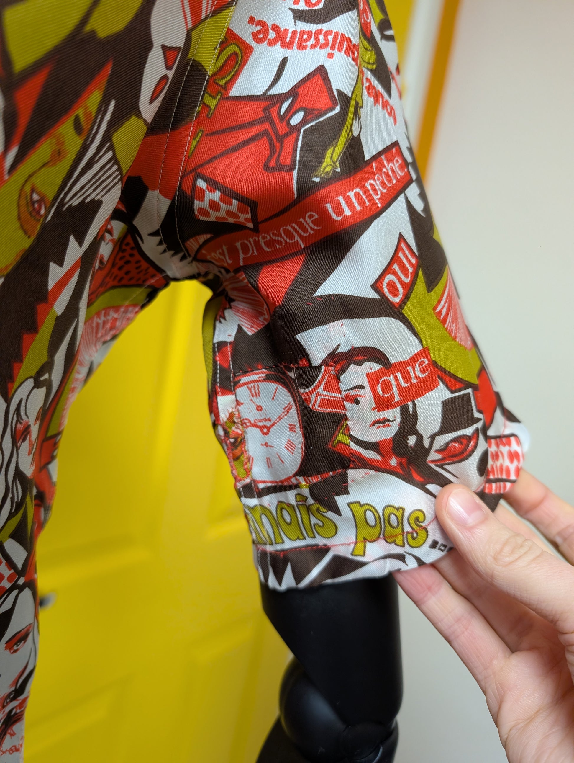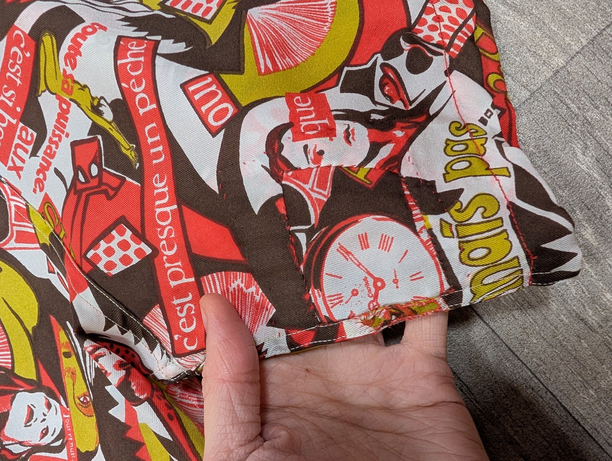 A fantastic shirt with a truly fabulous print! Unfortunately it is not in the best shape but still very wearable and the print very much distracts from the flaws