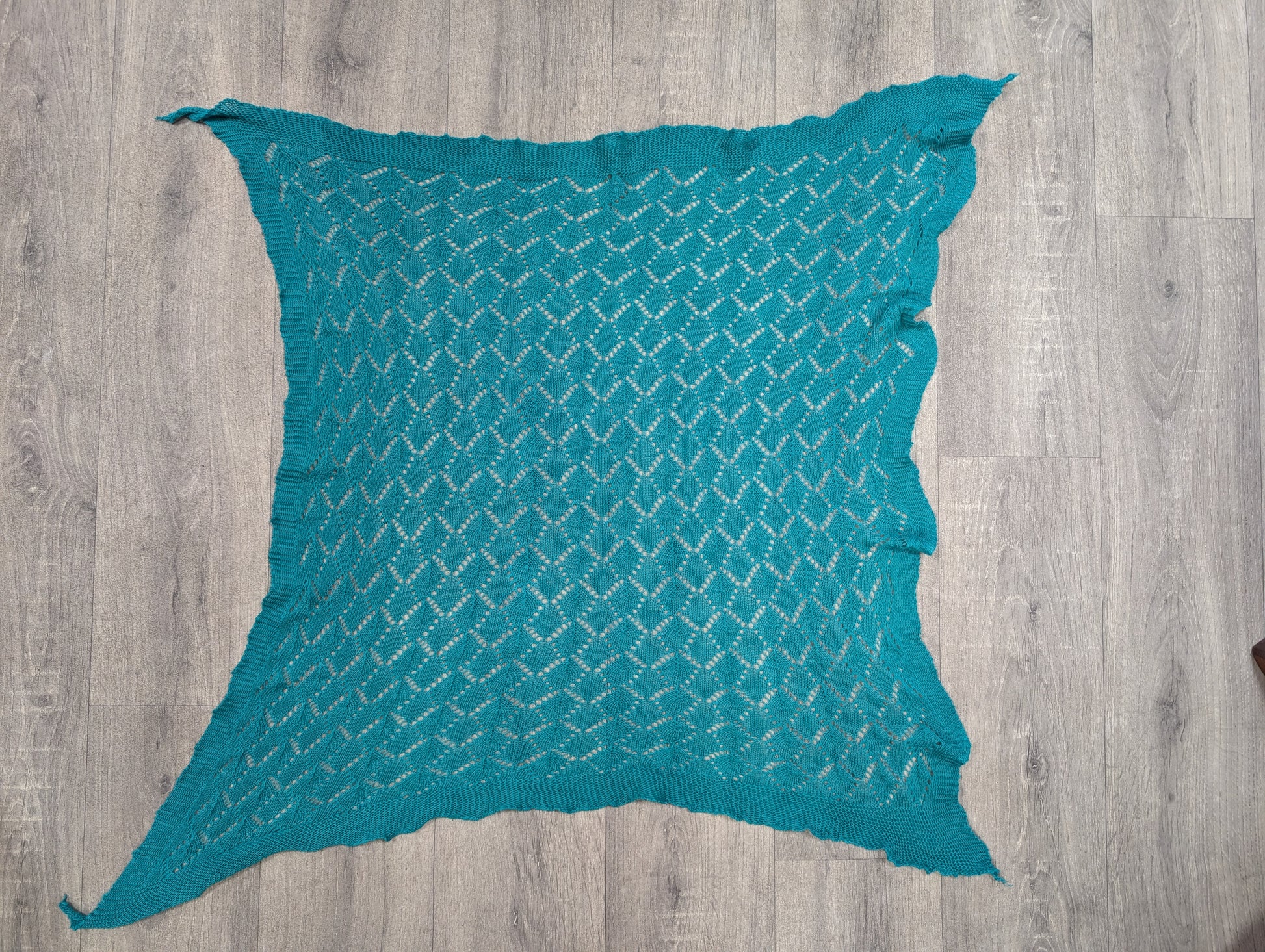 Measures approx 24" x 26" unstretched but has lots of stretch and movement due to the way it is knitted