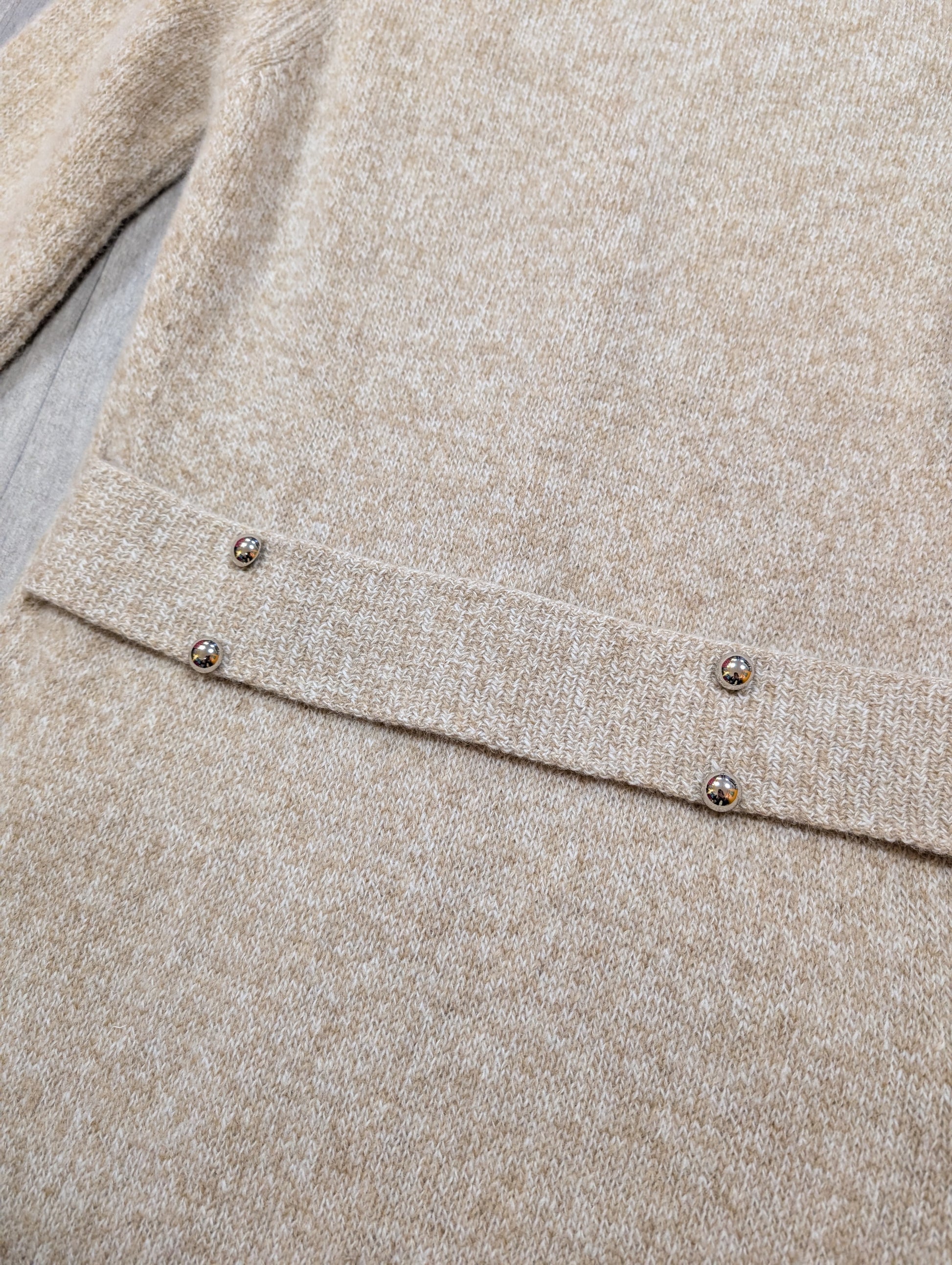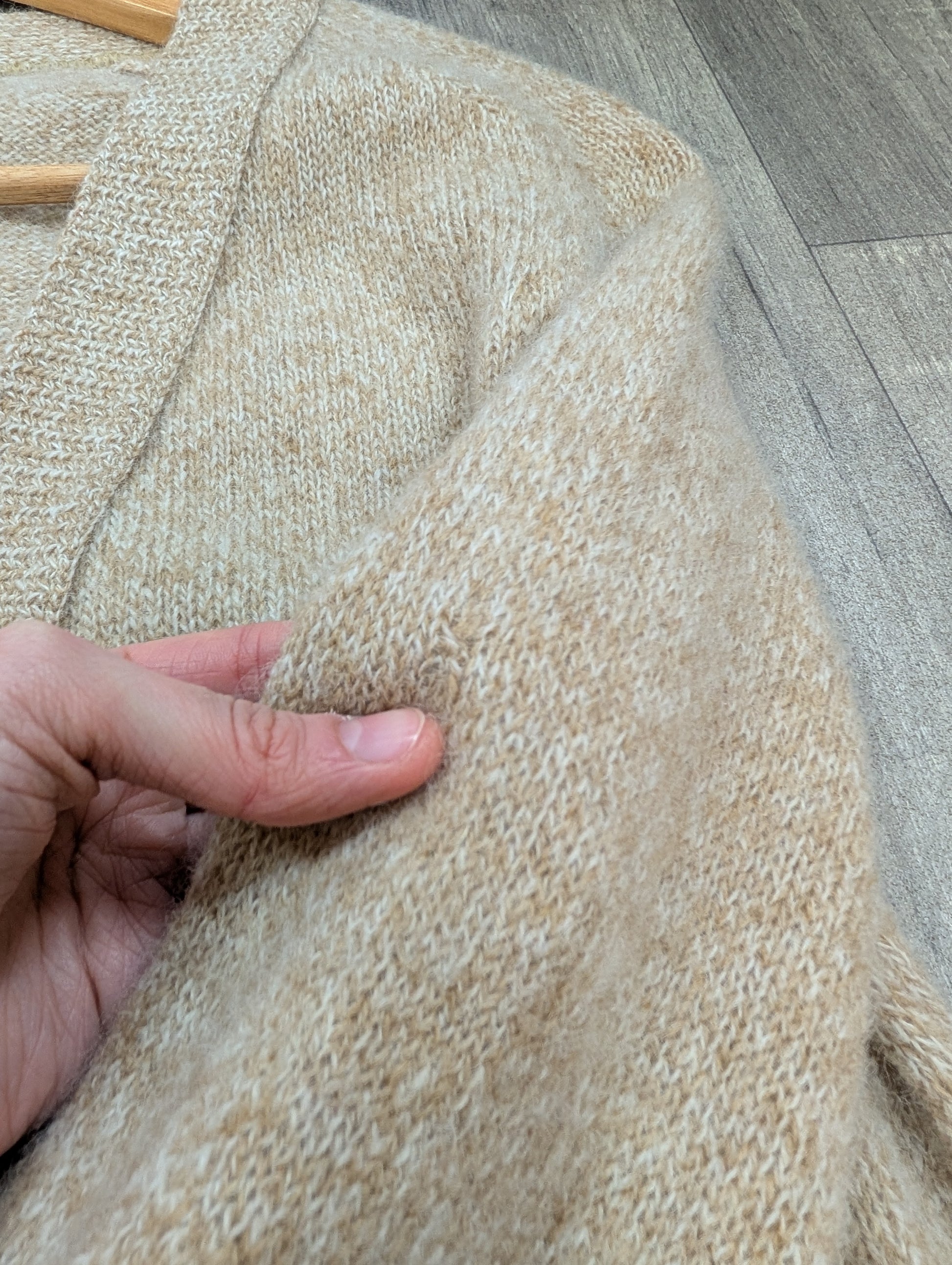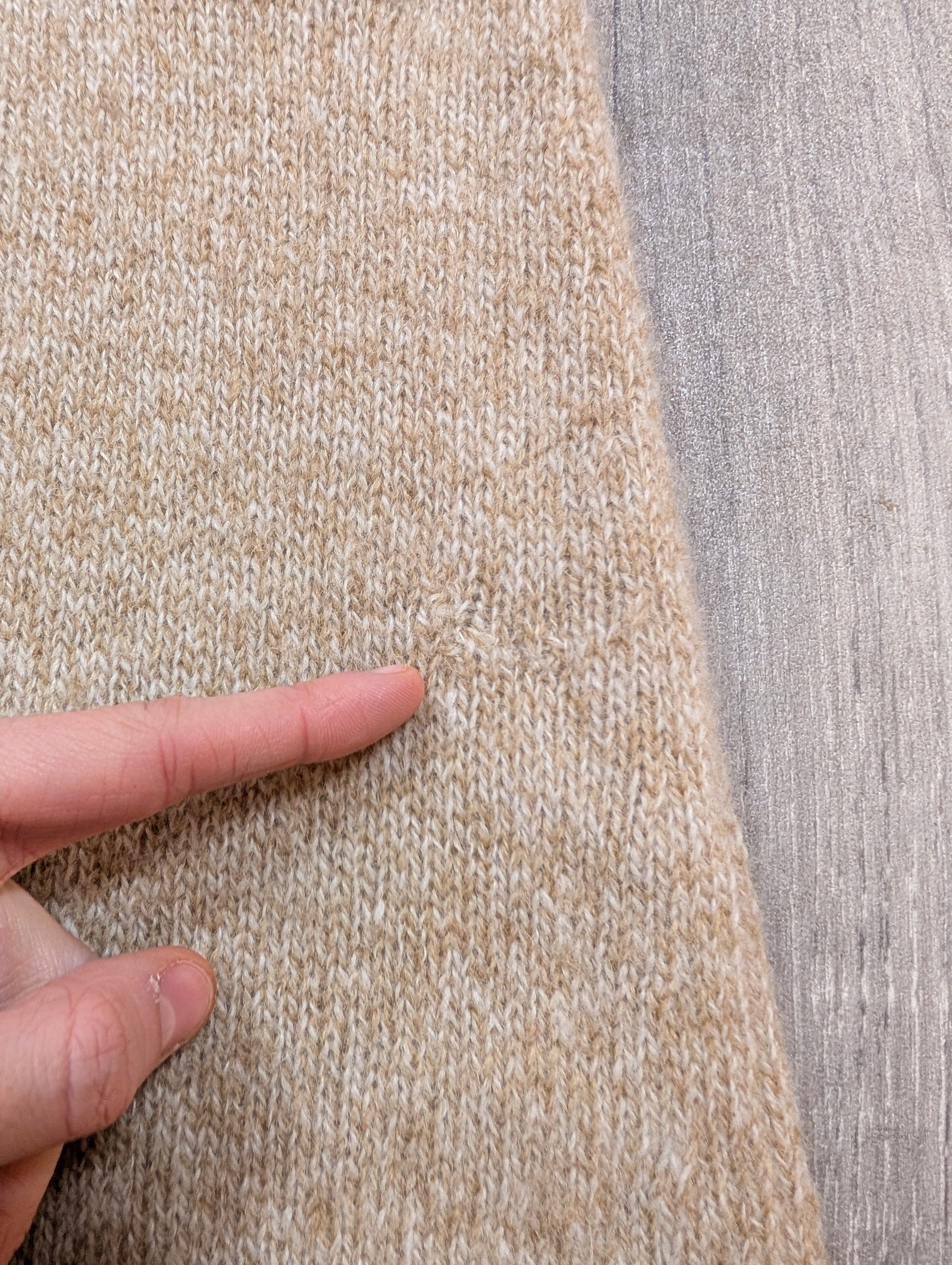- Two discreet mends. One lower front near the side seam and one on the side of one sleeve